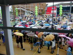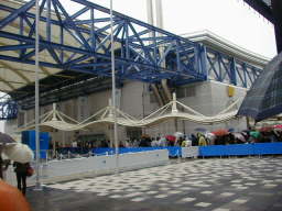 | ← グローバル・ループに上がって、西ゲートを見た所です。 コンビニ(ファミリーマート)は入り口を入る手前にありますが、 私達はこの写真の左側の方にいたため全く気付きませんでした。 ですから、弁当・ペットボトルを持っての入場は出来ませんでした。 この日は今迄で1番人数が多かったために 9時半開場を少し早めて、9時20分に開場しました。 |