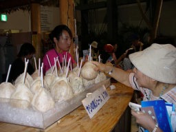 | グローバル・コモン6の南太平洋共同館で → 一度飲んでみたかった「ヤシの実ジュース(\700)」を・・・ イロイロな方から「マズイ、止めておいたほうがイイよ・・・」 と、散々言われたんですが、こういった機会じゃないと 飲む事がないのでチャレンジしました! 皆一口飲んで「もうイラナイ!」とギブアップ? 6人で飲めば1人分が少なくすむ・・・との思惑がハズレ 言いだしっぺの私1人が半分以上飲む事となりました。 |
